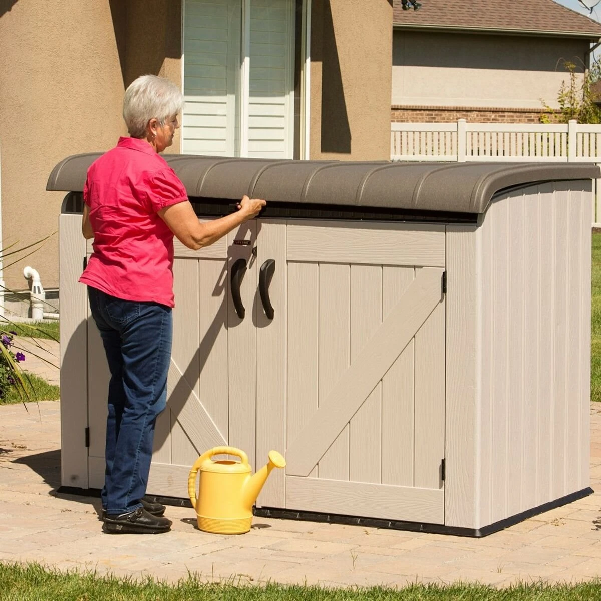 Baúl exterior horizontal con puertas y techo abatibles LIFETIME. Paneles rígidos de doble capa y techo de polietileno de alta densidad con protección UV, bisagras de acero resistente a la intemperie. Medida exterior 190x106x131 cm, interior 180,5×98,5×122,5 cm, capacidad total 2123 L. Puertas con tiradores y cierre para candado. Ideal para exterior e interior, guarda las bicis, leña, cajas…