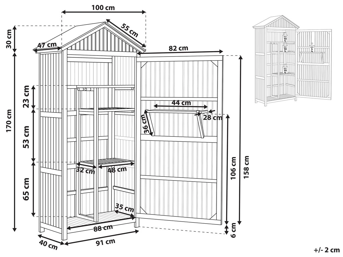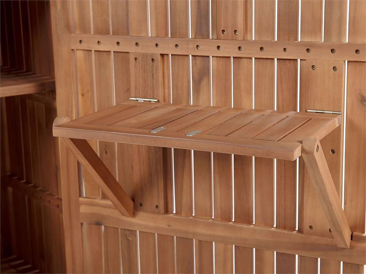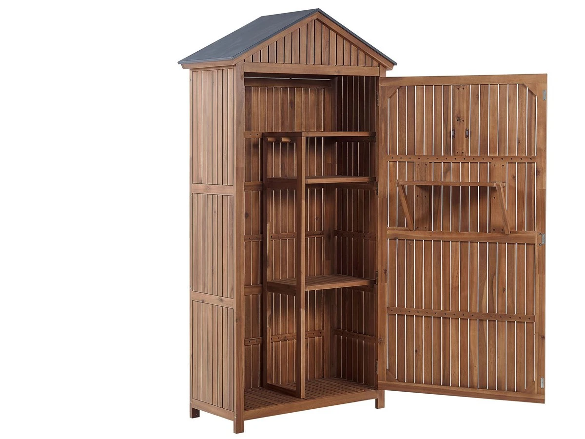 Armario de jardín. Ordena tu área al aire libre organizando tus herramientas con este cobertizo para herramientas de jardín. Hecho de madera de acacia resistente a la intemperie, el cobertizo cuenta con un techo de acero inclinado. El práctico mueble de almacenamiento con tres estantes y un estante plegable ofrece un amplio espacio para guardar herramientas pequeñas y grandes y accesorios de jardín. Detalles: Tipo de Producto: Armario de jardín Estilo: Rústico Color: Marrón Tipo de material: Madera maciza Material principal: Madera de acacia Material adicional: Acero inoxidable Acabado: Aceitado Capacidad: 35 Dimensiones: Profundidad: 40 cm Ancho: 100 cm Altura: 200 cm Peso: 56 kg Capacidad de peso: 5/10 kg La oferta incluye: 1 x Armario Ventajas: Perfecto para todo tipo de exterior, Gran durabilidad, Fabricación sólida y precisa, Mantenimiento sencillo, Espacio de almacenaje adicional Información de montaje: Requiere montaje completo. 20-40 min. Información adicional: El producto viene con un libro de cuidados detallado para ayudarte a mantener tus muebles en las mejores condiciones durante muchos años. Consulta estos consejos para garantizar el mantenimiento adecuado de tus muebles nuevos – encontrarás las instrucciones de mantenimiento junto con el manual de montaje. Texto de resistencia: El producto es resistente al agua, lo que significa que no se dañará expuesto a la lluvia o en contacto con otros líquidos. Puede dejarlo al aire libre incluso durante fuertes lluvias o humedad. Durante la temporada de invierno es recomendable almacenar el producto en el interior o bajo una cubierta impermeable. Resistencia: Agua Consejos de mantenimiento: Madera de acacia: 1.Durante el invierno o en condiciones climáticas adversas, utilice una funda protectora o guarde los muebles en el interior 2.Los muebles con acabado de aceite deben volverse a engrasar antes de ponerlos en uso y al menos una vez al año, especialmente en el clima húmedo 3.Limpiar con un limpiador suave y un paño suave en la dirección de la veta. Secar con un paño inmediatamente después de limpiar.