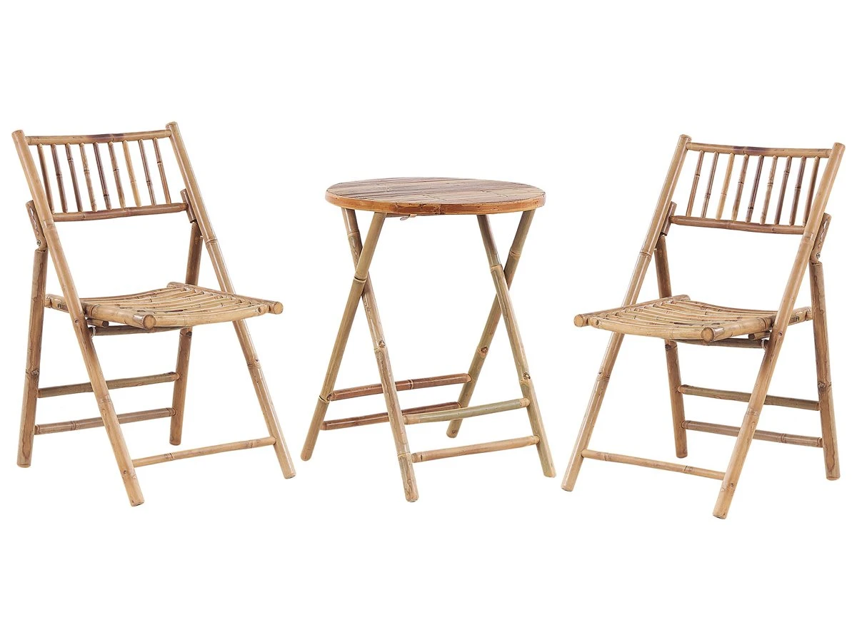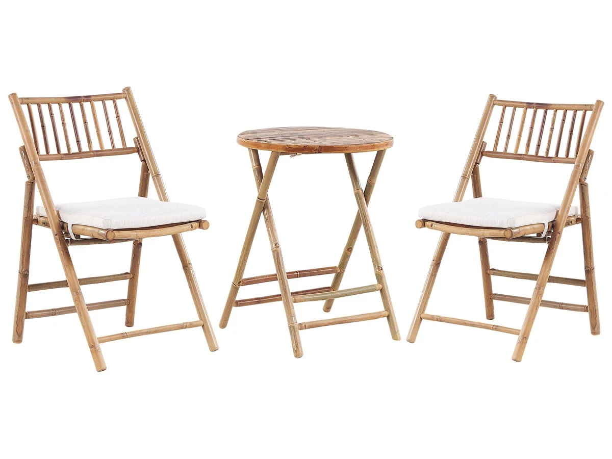 Juego de exterior. Añade un toque natural a tu zona exterior con este conjunto de balcón. Está fabricado a partir de madera de bambú de alta calidad, resistente y duradero. Los cojines de asiento acolchado proporcionan la máxima comodidad de uso. El mecanismo de plegado permite ahorrar espacio y facilita el desplazamiento de una habitación a otra. Detalles: Tipo de Producto: Conjunto bistro Estilo: Boho Color: Madera clara Tonalidad: Blanco crema Tipo de material: Tejido Material principal: Madera de bambú Material adicional: Poliéster Composición del Material: 100% Poliéster Acabado: Natural Densidad de espuma del asiento: 180 kg/m3 Dimensiones: Dimensiones de la silla: 87x55x49 cm Dimensiones de la mesa de centro: 74x57x57 Espesor del asiento: 3 cm Altura del asiento: 43 cm Peso: 12 kg Capacidad de peso de la silla: 150 kg Capacidad de peso de la mesa: 70 kg La oferta incluye: 2 x Cojines del asiento, 2 x Silla, 1 x Mesa Ventajas: Las tiras ofrecen una fijación segura, Cómodos apoyabrazos, Resistencia UV 5 (ISO 105-B02, Materiales pensados para el uso en el exterior, Plegable, ahorra espacio Información de montaje: No requiere montaje Información adicional: Por favor, ten en cuenta que la madera es un producto natural, y cada pieza puede presentar ligeras variaciones. Las diferencias en el color o la textura, como las arrugas u otras características naturales, no se consideran un defecto ni tampoco una base de reclamación Texto de resistencia: Los muebles resistentes a los rayos UV muestran una mayor resistencia a la decoloración. Sin embargo, recomendamos que el producto se guarde en el interior cuando no esté en uso. Esto asegurará la máxima durabilidad de los muebles. Resistencia: Rayos UV Consejos de mantenimiento: Madera de bambú: 1.Trata las zonas enmohecidas de los muebles con aceite de limón 2.Con el paso del tiempo, la suciedad se puede acumular en la madera de bambú. Asegúrate de realizar una limpieza anual a fondo. Utiliza un cepillo suave y agua tibia con jabón neutro 3.Antes del inicio o final de la temporada, pon un poco de sellador. Solo en lugares con sombra, que no estén ni húmedos ni mojados. Si las condiciones climatológicas son adversas, usa una funda protectora o guarda el mueble en el interior 4.Después de limpiar, frota con una esponja. Por último, seca con una toalla y añade a la madera una capa de cera o aceite. Poliéster: 1.No secar en secadora y no planchar 2.Lavar a mano o seleccionar un ciclo de lavado de lana (30 ° C, a menos que el fabricante especifique lo contrario. Lavar del revés con la cremallera cerrada 3.Cuando no esté en uso, manténgalo en un lugar limpio y seco para protegerlo de las condiciones atmosféricas.