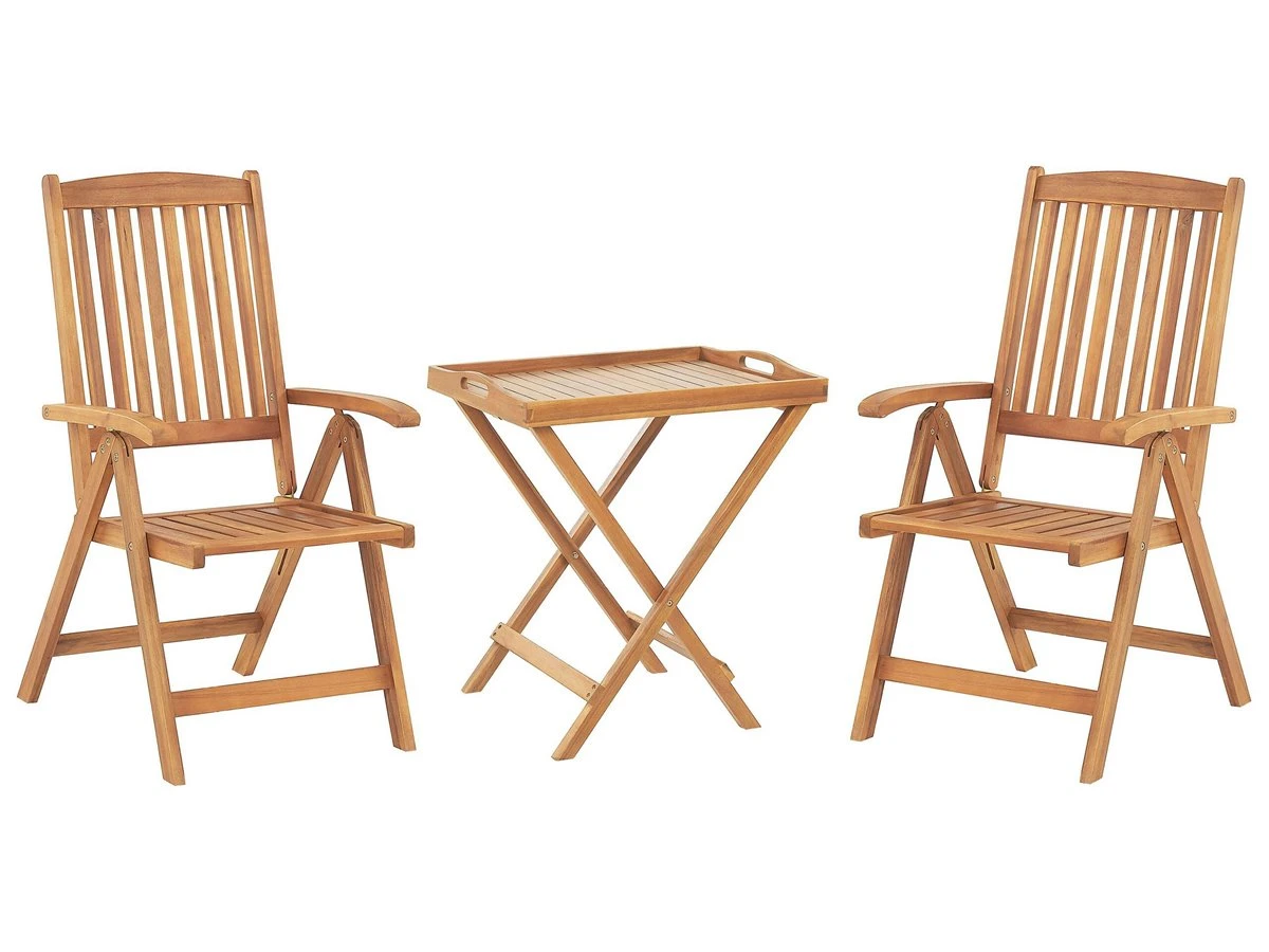 Conjunto de balcón de madera de acacia. Este conjunto de balcón incluye una mesa de madera de acacia y 2 sillas a juego. Los tres muebles son plegables, por lo que se pueden almacenar con facilidad. Perfecto para tu patio o balcón, aporta estilo y comodidad a tu exterior. Está fabricado en madera de acacia en un tono claro. Este tipo de madera es muy dura e impresiona por su belleza natural y resistencia. Conjunto perfecto para cualquier balcón rústico, terraza moderna o exterior mediterráneo. Detalles: Tipo de Producto: Conjunto bistro Estilo: Tradicional Color: Madera clara Tipo de material: Madera maciza Material principal: Madera de acacia Material de la superficie: Madera maciza Acabado: Aceitado Dimensiones: Dimensiones de la silla: 54x69x105 cm Dimensiones de la mesa de centro: 45x68x73 Altura del asiento: 44 cm Peso: 26 kg Capacidad de peso de la silla: 160 kg Capacidad de peso de la mesa: 10 kg La oferta incluye: 1 x Mesa auxiliar, 2 x Silla Ventajas: Respaldo ajustable en 6 posiciones, La parte superior desmontable se puede utilizar como tabla para servir, Cómodos apoyabrazos, Materiales de calidad, Plegable para un fácil almacenamiento, Respaldo ajustable Información de montaje: No requiere montaje Información adicional: Por favor, ten en cuenta que la madera es un producto natural, y cada pieza puede presentar ligeras variaciones. Las diferencias en el color o la textura, como las arrugas u otras características naturales, no se consideran un defecto ni tampoco una base de reclamación, El producto viene con un libro de cuidados detallado para ayudarte a mantener tus muebles en las mejores condiciones durante muchos años. Consulta estos consejos para garantizar el mantenimiento adecuado de tus muebles nuevos – encontrarás las instrucciones de mantenimiento junto con el manual de montaje. Texto de resistencia: Gracias a su resistencia al agua, puedes utilizar el producto al aire libre y dejarlo a la intemperie durante lluvias ligeras. Si no es posible guardarlo en un lugar cerrado y protegido, recomendamos utilizar una funda protectora. La exposición prolongada a la humedad puede provocar daños en el mueble. Resistencia: Agua ligera / humedad Consejos de mantenimiento: Madera de acacia: 1.Durante el invierno o en condiciones climáticas adversas, utilice una funda protectora o guarde los muebles en el interior 2.Los muebles con acabado de aceite deben volverse a engrasar antes de ponerlos en uso y al menos una vez al año, especialmente en el clima húmedo 3.Limpiar con un limpiador suave y un paño suave en la dirección de la veta. Secar con un paño inmediatamente después de limpiar.