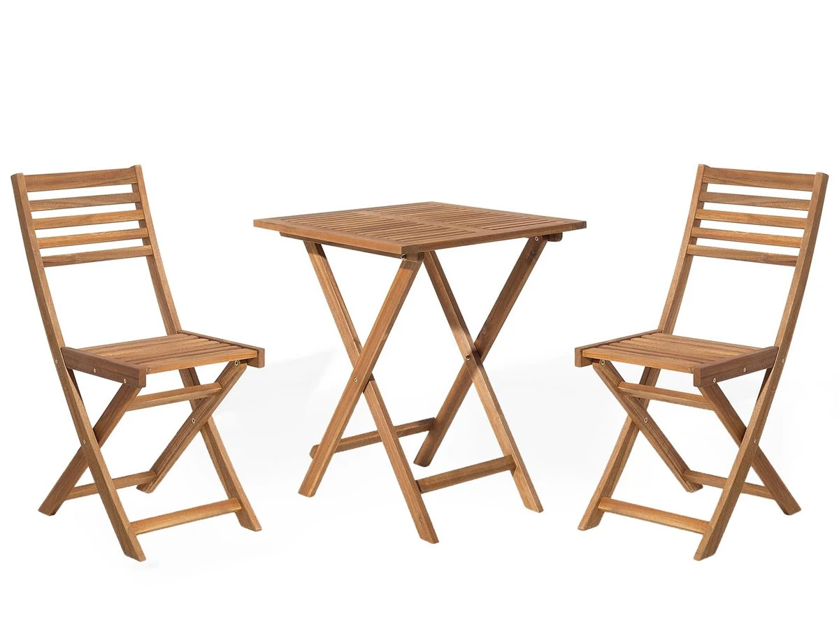 Conjunto de mesa y 2 sillas de madera. Transforma tu terraza o balcón en un paisaje pintoresco con este juego de muebles para balcón. Consta de dos sillas con cojines de respaldo y una pequeña mesa de centro con tapa de cristal, tan funcional como decorativa. Los cojines de doble cara, con un colorido estampado floral impreso en uno de los lados, lo que mejora el aspecto general del conjunto y realza su versatilidad. El marco de acero y el ratán sintético hacen que los muebles sean resistentes y robustos, por lo que son aptos para su uso en exteriores. Detalles: Tipo de Producto: Conjunto bistro Estilo: Rústico Color: Madera clara Tipo de material: Madera maciza Material principal: Madera de acacia Material de la superficie: Madera maciza Acabado: Aceitado Dimensiones: Dimensiones de la silla: 37x44x84 cm Dimensiones de la mesa de centro: 60x60x75 Altura del asiento: 45 cm Peso: 18 kg Capacidad de peso de la silla: 120 kg Capacidad de peso de la mesa: 120 kg La oferta incluye: 1 x Mesa, 2 x Silla Ventajas: Perfecto para todo tipo de exterior, Los nudos y vetas de madera natural hacen que cada pieza sea única, Materiales de la más alta calidad, Plegable para un fácil almacenamiento, Mantenimiento sencillo Información de montaje: Requiere montaje parcial. 20-40 min. Información adicional: Por favor, ten en cuenta que la madera es un producto natural, y cada pieza puede presentar ligeras variaciones. Las diferencias en el color o la textura, como las arrugas u otras características naturales, no se consideran un defecto ni tampoco una base de reclamación, El producto viene con un libro de cuidados detallado para ayudarte a mantener tus muebles en las mejores condiciones durante muchos años. Consulta estos consejos para garantizar el mantenimiento adecuado de tus muebles nuevos – encontrarás las instrucciones de mantenimiento junto con el manual de montaje. Texto de resistencia: Gracias a su resistencia al agua, puedes utilizar el producto al aire libre y dejarlo a la intemperie durante lluvias ligeras. Si no es posible guardarlo en un lugar cerrado y protegido, recomendamos utilizar una funda protectora. La exposición prolongada a la humedad puede provocar daños en el mueble. Resistencia: Agua ligera / humedad Consejos de mantenimiento: Madera de acacia: 1.Limpiar con un limpiador suave y un paño suave en la dirección de la veta. Secar con un paño inmediatamente después de limpiar 2.Durante el invierno o en condiciones climáticas adversas, utilice una funda protectora o guarde los muebles en el interior 3.Los muebles con acabado de aceite deben volverse a engrasar antes de ponerlos en uso y al menos una vez al año, especialmente en el clima húmedo.