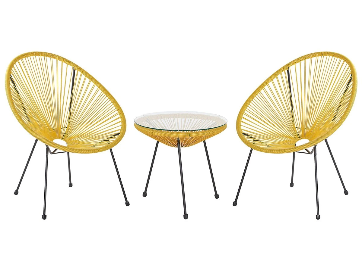 Conjunto de balcón de ratán. Este conjunto de balcón de inspiración mexicana refresca cualquier área interior y exterior. Está constituido por una mesa y 2 sillas. La superficie de asiento presenta un tejido de cuerdas fabricado a partir de ratán sintético. El tablero de la mesa de vidrio templado está asegurado con ventosas. Ideal para cualquier sala de estar o zona exterior de estilo moderno o retro. Detalles: Tipo de Producto: Conjunto bistro Estilo: Moderno Color: Verde Tipo de material: Ratán sintético Material principal: Ratán sintético Material adicional: Vidrio templado Material de la superficie: Vidrio Acabado: Revestimiento en polvo Dimensiones: Dimensiones de la silla: 70x90x87 cm Dimensiones de la mesa de centro: 50x50x49 Altura del asiento: 41 cm Peso: 11 kg Capacidad de peso de la silla: 160 kg Capacidad de peso de la mesa: 50 kg La oferta incluye: 1 x Mesa, 2 x Silla Ventajas: Asiento bajo y profundo, Patas estables y resistentes, Ideal para uso en interiores y exteriores, Montaje muy sencillo, Patas con tapas antideslizantes de seguridad, Ligero y sólido a la vez, muy fácil de mover, Tablero en vidrio templado de seguridad Información de montaje: Requiere montaje parcial. 20-40 min. Información adicional: Abre el embalaje con cuidado, especialmente cuando utilizas herramientas afiladas o puntiagudas, ya que pueden dañar el producto Texto de resistencia: Los muebles resistentes a los rayos UV muestran una mayor resistencia a la decoloración. Sin embargo, recomendamos que el producto se guarde en el interior cuando no esté en uso. Esto asegurará la máxima durabilidad de los muebles. Resistencia: Rayos UV Consejos de mantenimiento: Ratán sintético: 1.Se recomienda utilizar una funda protectora para la temporada de invierno o, si es posible, para mantener los muebles secos y frescos en el interior 2.Limpiar con detergentes a base de jabón. No utilizar limpiadores químicos corrosivos 3.Los utensilios o accesorios de vidrio pueden sobrecalentar la superficie 4.Para alargar la vida útil del mueble, protéjalo de la exposición directa al sol. Acero: 1.Quite las tapas protectoras con regularidad para que salga todo el líquido, déjelas secar y utilice un spray anticorrosión si es necesario 2.Limpiar con detergentes suaves 3.Los muebles de acero y sus elementos no deben exponerse al agua. De lo contrario, existe la posibilidad de que el agua oxidada salga de las tuberías del marco 4.Cuando no estén en uso, los muebles deben guardarse en el interior o bajo una cubierta protectora 5.Para aumentar la durabilidad del artículo, manténgalo seco y recuerde la limpieza regular 6.Cualquier daño a la capa de pintura exterior debe protegerse de la humedad 7.Para garantizar la protección contra la corrosión, evite los limpiadores alcalinos o ácidos. Después de limpiar, secar bien. Vidrio templado: 1.Secar después de la lluvia o la nieve. Durante el invierno, utilice una funda protectora o guarde los muebles en el interior 2.Para evitar rayones, no use un limpiador cremoso 3.Limpiar con un detergente suave o acondicionador de vidrio con un paño suave. Secar después de limpiar.