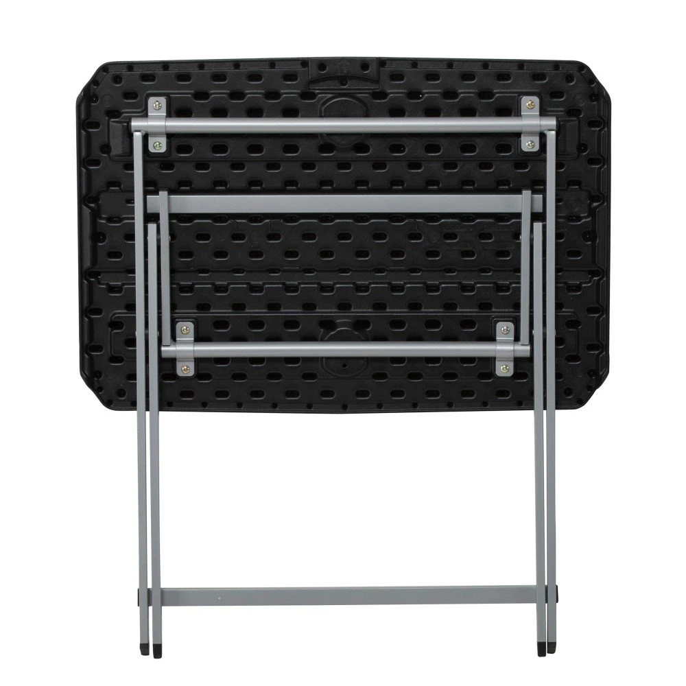 Mesa plegable negra de uso individual Lifetime. Tablero de polietileno de alta densidad con protección UV y estructura robusta de acero con revestimiento en polvo antióxido. Medidas tablero: 75 x 50,5 cm, altura: 66 cm. Sus patas y tablero se pliegan verticalmente y cuenta con asa de transporte para moverla fácilmente y almacenarla sin apenas ocupar espacio. Duradera, resistente y ligera. Perfecta para uso personal.