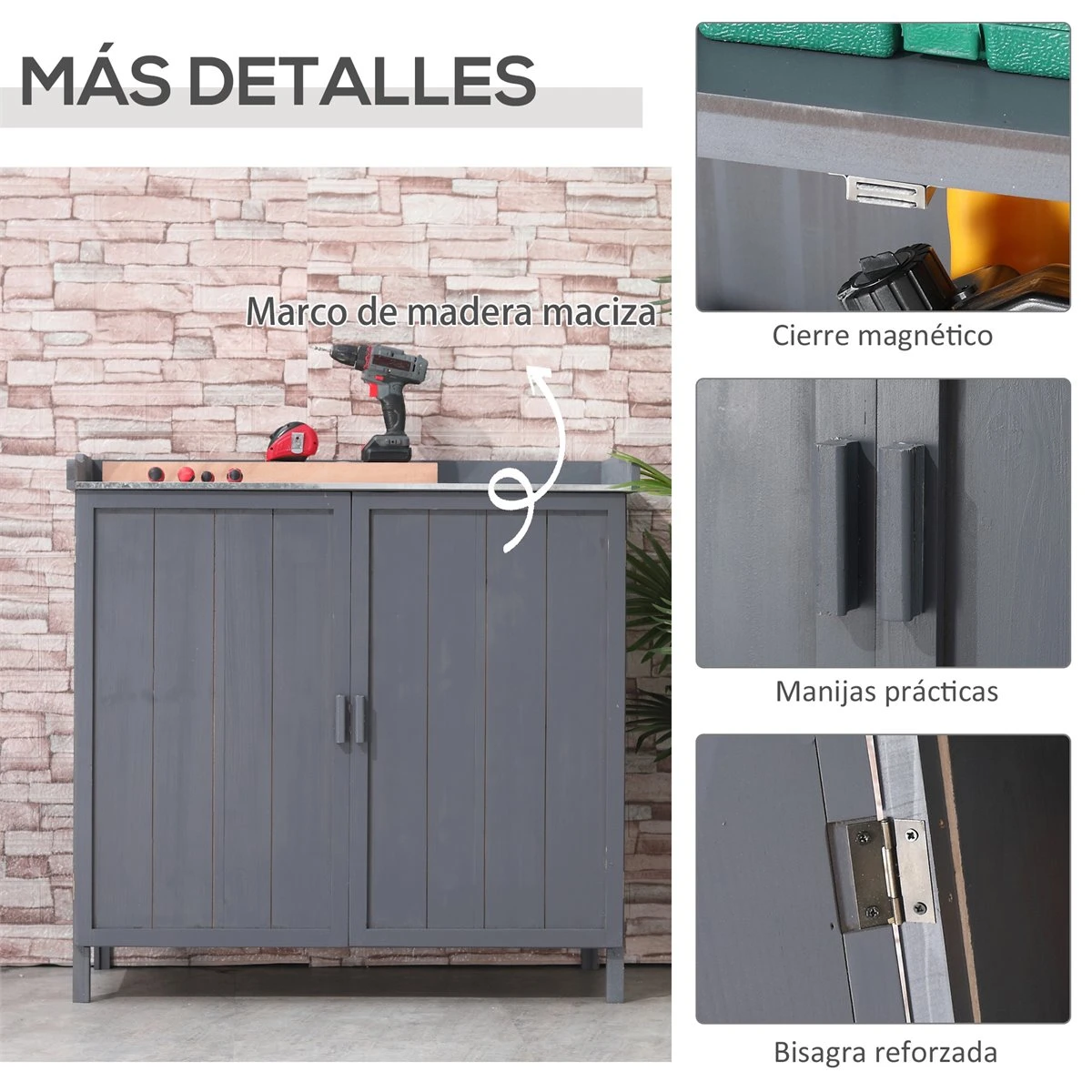 - – DISEÑO 2 EN 1: Este armario de almacenaje de jardín se puede utilizar como un espacio de almacenamiento adicional en tu jardín, pero también puede servir como mesa de plantación para hacer cómodamente tus tareas de poda o arreglo floral o simplemente para dejar tus plantas expuestas – BANCO DE TRABAJO METÁLICO: Este banco de trabajo de metal galvanizado está especialmente diseñado para una mayor resistencia a la intemperie y a la oxidación. Ideal para mantener el interior del mueble seco incluso en días que pueda llover o con humedad en el ambiente – GRAN ESPACIO DE ALMACENAMIENTO: Este armario de herramientas para exterior tiene un gran espacio de almacenamiento, una amplia encimera y un armario con cierre magnético con 2 estantes en el interior. Es perfecto para guardar tus herramientas de jardín, juguetes y más – ESTRUCTURA RESISTENTE: Este mueble exterior de almacenamiento está hecho de madera de abeto con pintura con revestimiento impermeable para mayor resistencia a la intemperie – MEDIDAS TOTALES: 98x48x95,5 cm (LxANxAL. Peso máximo soportado: 50 kg (encimera, 15 kg (estante. Requiere montaje