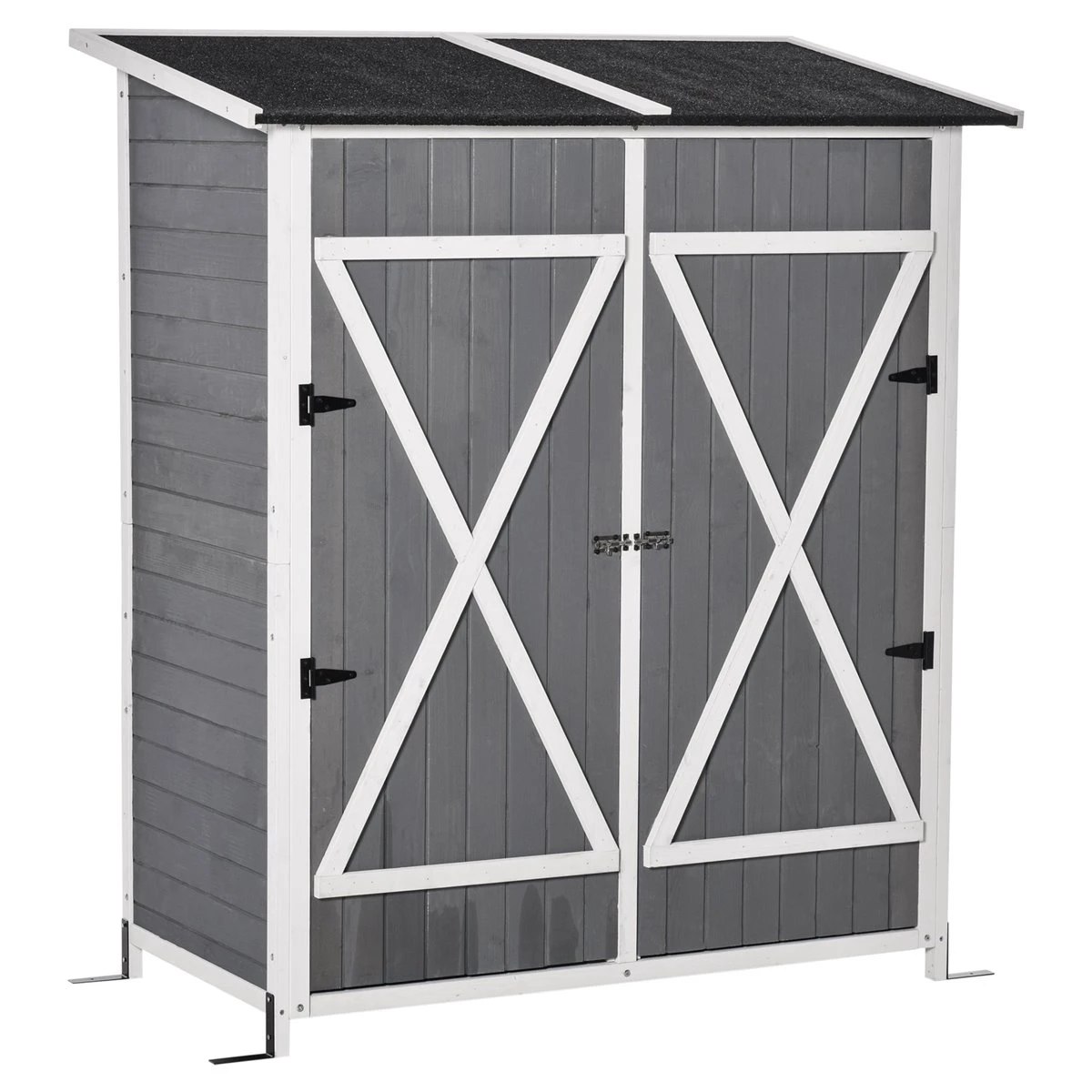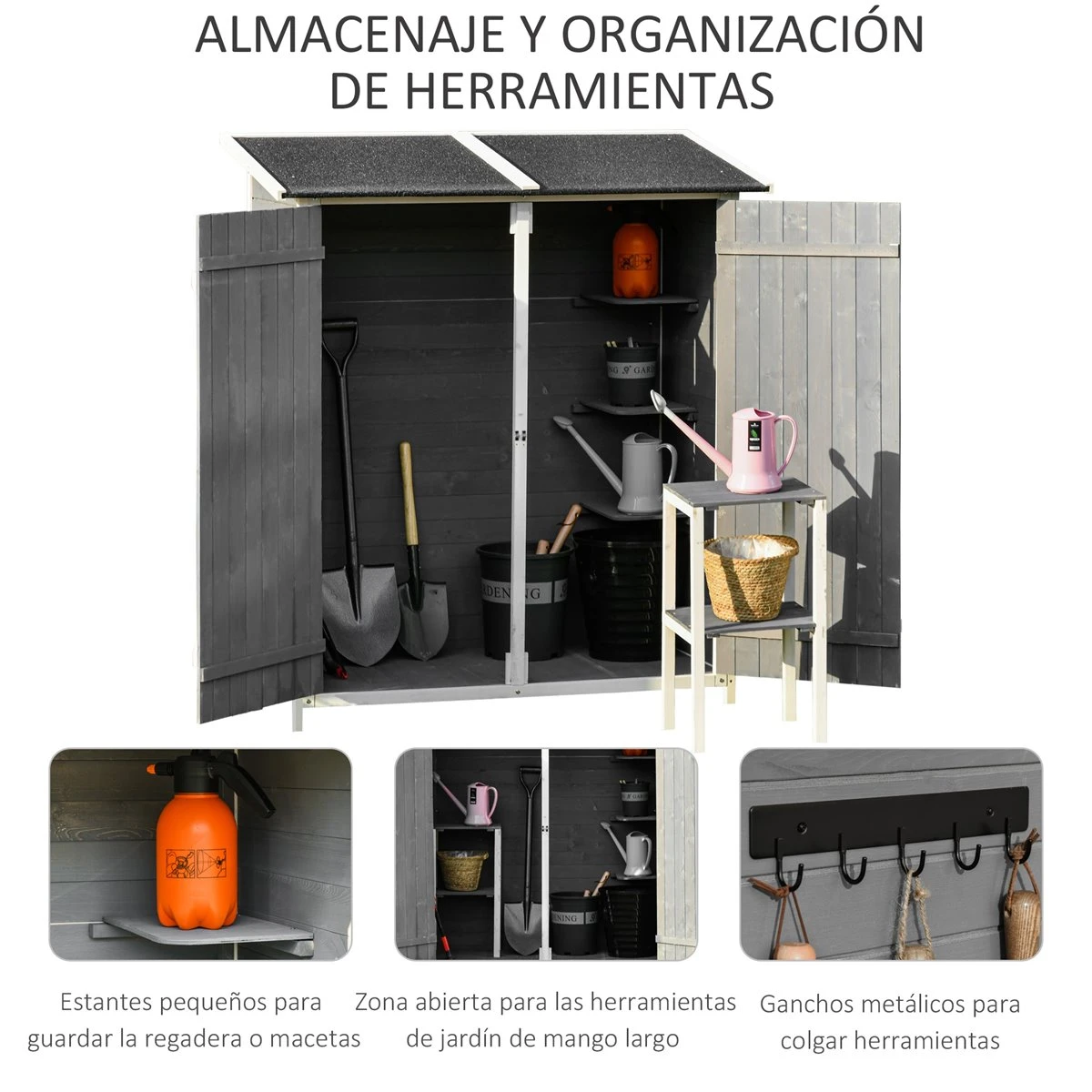 - – ESTANTERÍA INDEPENDIENTE: Equipada con una estantería movible de dos niveles. Puedes colocarla en la caseta para almacenar herramientas o usarla como banco de trabajo para tu jardín – COBERTIZO RESISTENTE: Hecho de madera de abeto, techo asfáltico y accesorios metálicos como las bisagras y los pestillos, este cobertizo cuenta con una estructura resistente y es apto para usar en exteriores – AMPLIO Y SEGURO: Este cobertizo cuenta con espacio suficiente para que puedas tener ordenadas tus herramientas de jardín sean grandes, pequeñas, de mango largo, etc. Cuenta con 2 puertas amplias que facilitan el acceso y las dos se pueden cerrar con pestillo de seguridad – DISEÑO MEJORADO: A diferencia de su antecesor, a este modelo le hemos añadido 3 estantes pequeños en el interior, así como también 5 ganchos para colgar herramientas. Y las patas cuentan con accesorios para poder fijar en el suelo mediante tornillos o piquetas según el tipo de terreno – MEDIDAS TOTALES: 139x75x160 cm (LxANxAL; Medidas del interior: 120x63x137/150 cm (LxANxAL; Peso máximo soportado: 5 kg (estantes pequeños, 40 kg (estante inferior. Requiere montaje