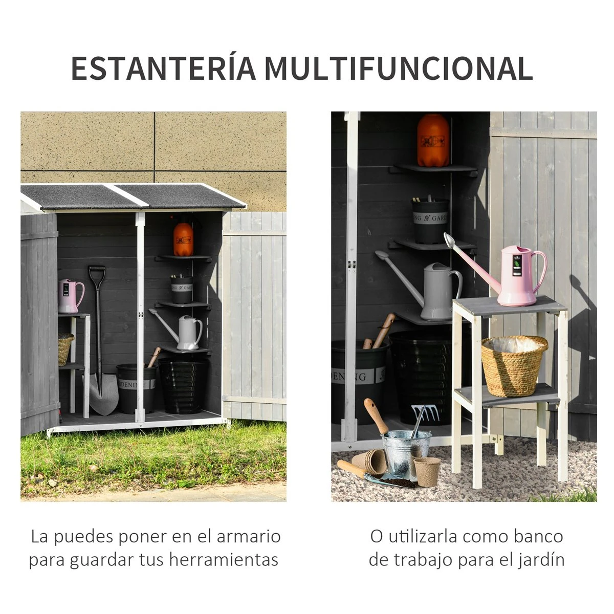 - – Incluye una estantería de 2 niveles movible, para usar junto al cobertizo o sola