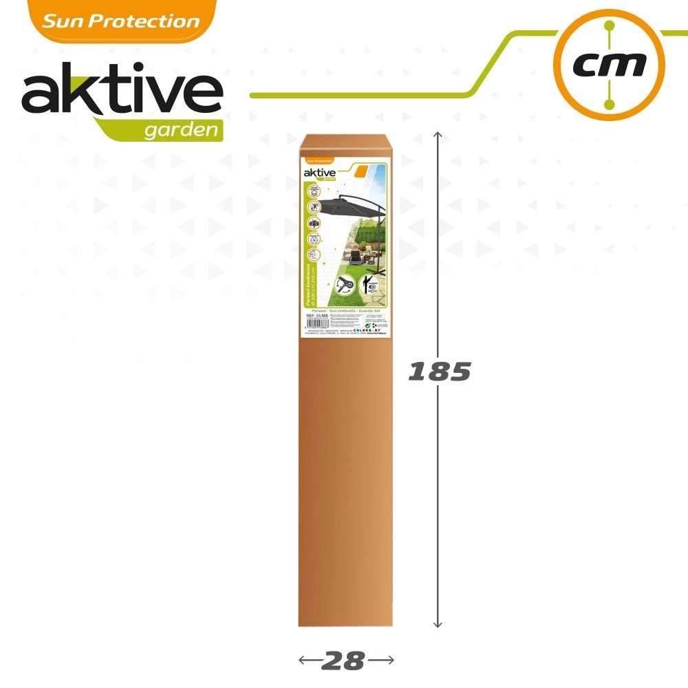 Crea una zona de sombra en tu terraza o jardín con el parasol excéntrico Aktive Garden modelo Banana. La sombrilla de 6 varillas es 100 % poliéster y su diámetro es de 300 cm. La estructura del parasol es de aluminio con mástil de 42-48 cm de grosor y pie de apoyo en cruz, lo puedes usar así o colocar hasta 4 losetas encima. Mecanismo de inclinación manual y sistema de apertura con manivela.