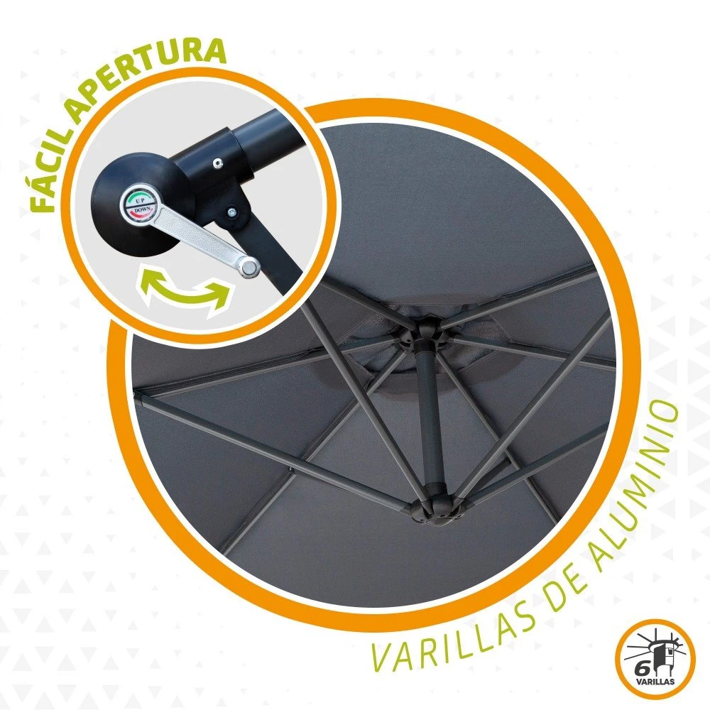 - Monataje: mecanismo de inclinación manual y sistema de apertura con manivela, el parasol gira 360º para orientarlo sin tener que moverlo