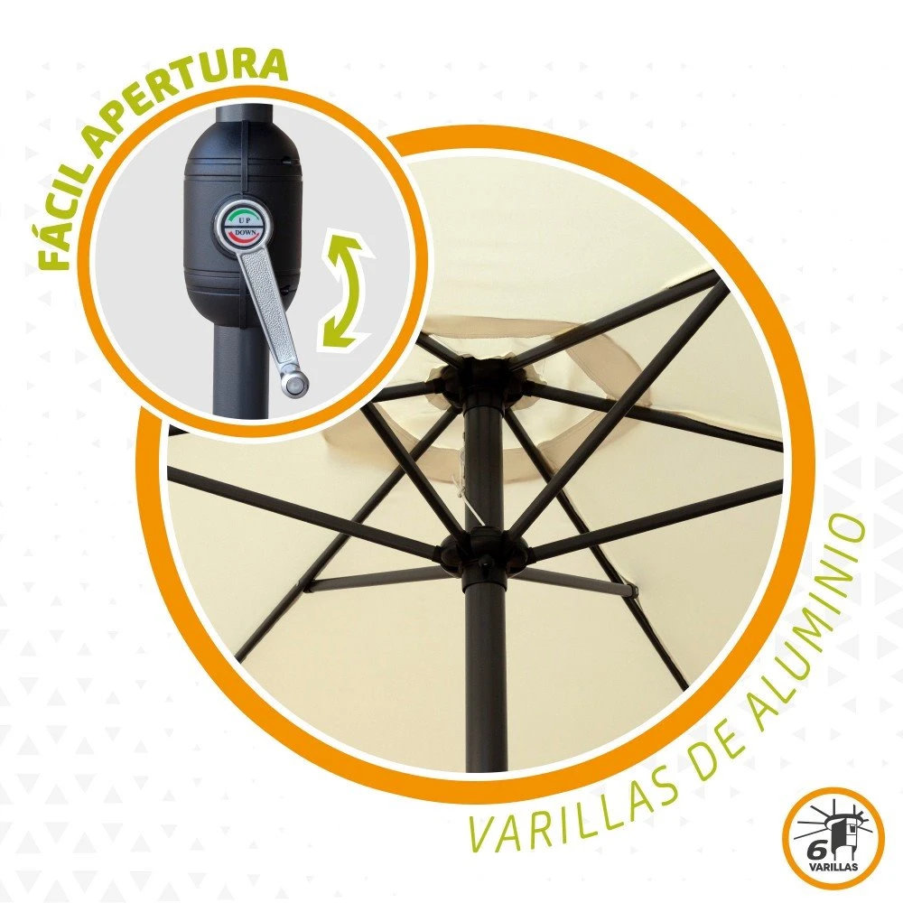 - Medidas: el diámetro del parasol es de 250 cm y la altura de 240 cm