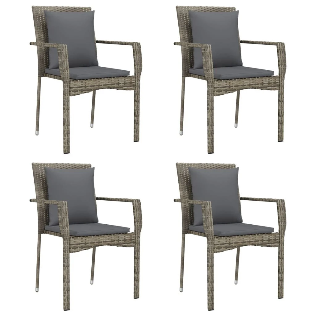 Este moderno juego de comedor de jardín, con un diseño elegante y contemporáneo, es una excelente opción para comer o relajarse en el jardín. Material resistente a la intemperie: El ratán PE, también conocido como ratán sintético, es resistente a la intemperie y fácil de limpiar. La parte exterior se mantiene hermosa durante mucho tiempo. Ofrece una gran calidad, comodidad y aspecto estético.Estructura robusta: Las estructuras de acero con recubrimiento en polvo hacen que el juego de comedor para exterior sea resistente y estable para usar a diario al aire libre.Superficie práctica: La superficie de madera maciza de acacia es perfecta para colocar bebidas, comida y adornos. Es bonita y fácil de limpiar.Diseño modular: El juego de comedor para patio es flexible y fácil de mover, por lo que puedes combinarlo con otros segmentos modulares de la web para crear tus propias configuraciones personales de muebles de comedor para jardín.Cómodo asiento: El respaldo añade un plus de comodidad al asiento de la silla de jardín. Además, los cojines gruesos y acolchados proporcionan comodidad al asiento. Información útil:Para facilitar al máximo el montaje, cada producto se entrega con un manual. Nota:Para asegurarte de que tus muebles de exterior se mantengan hermosos, recomendamos protegerlos con una funda impermeable. Color: Negro y grisColor de cojín: Gris oscuroSilla de jardín:Material: Ratán PE, acero con recubrimiento en polvoMaterial de la funda del cojín: Tela (100% poliésterDimensiones: 59 x 53,5 x 88 cm (ancho x profundo x altoDimensiones de asiento: 43 x 43 cm (ancho x profundoAltura del asiento desde el suelo: 44 cmAltura del apoyabrazos desde el suelo: 64,5 cmAnchura del reposabrazos: 6 cmDimensiones del cojín de respaldo: 37 x 37 x 10 cm (ancho x profundo x grosorDimensiones del cojín de asiento: 40 x 43 x 3 cm (ancho x profundo x grosorMesa:Material: Acero con recubrimiento en polvo, madera maciza de acacia con acabado de aceiteDimensiones: 80 x 80 x 74 cm (largo x ancho x altoLa entrega incluye:4 x Sillas de jardín4 x Cojín trasero4 x Cojines de asiento1 x Mesa